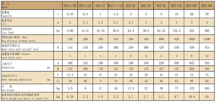 0.25t-1.5tHSZ-C型武林飛鴿手拉葫蘆性能參數(shù)表: