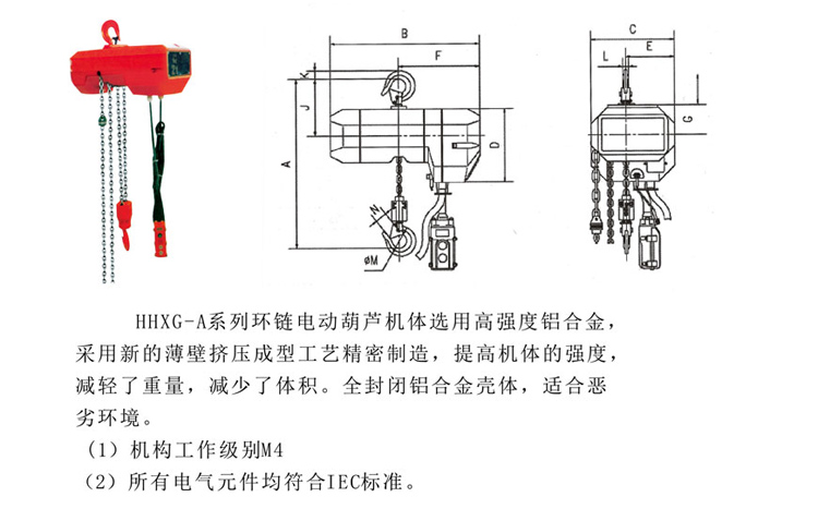環(huán)鏈電動(dòng)葫蘆HHXG-A型0.125-2T電機(jī)采用高起動(dòng)轉(zhuǎn)矩圓柱轉(zhuǎn)子電機(jī),應(yīng)用范圍更廣,能達(dá)到用戶的使用要求,防護(hù)等級(jí)達(dá)到IP54。手電門安全電壓控制防護(hù)等級(jí)達(dá)到IP65。